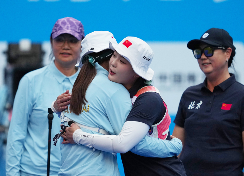 新华社照片,深圳(广东),2025年11月16日\n 11月16日,北京队选手李佳蔓(右二)在比赛后拥抱上海队选手朱静怡(左二)。\n 当日,第十五届全国运动会射箭女子反曲弓个人铜牌决赛在广东深圳举行。北京队选手李佳蔓6比2战胜上海队选手朱静怡,获得铜牌。\n 新华社记者 郝源 摄
