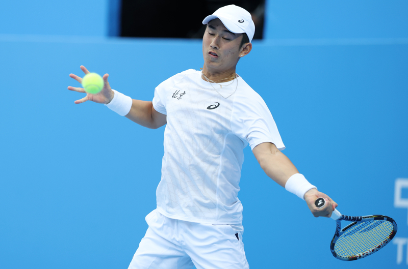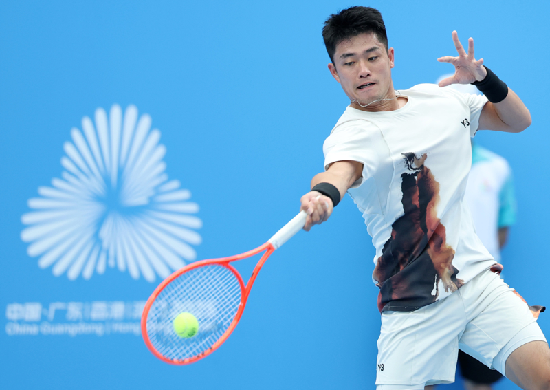 新华社照片,横琴(广东),2025年11月15日\n 11月15日,浙江队选手吴易昺在比赛中回球。最终,他2比0战胜天津队选手刘少云,晋级下一轮。\n 当日,第十五届全国运动会网球项目男子单打第二轮在广东横琴举行。\n 新华社记者 张晨霖 摄