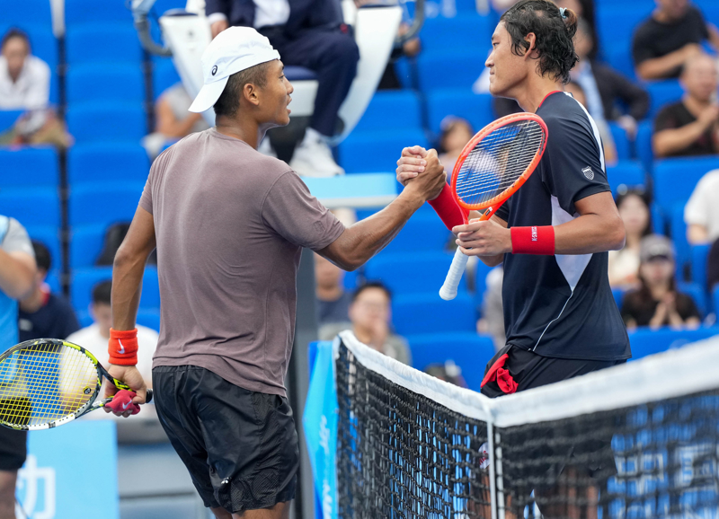新华社照片,横琴(广东),2025年11月17日\n 11月17日,张之臻(右)与尼敦坚赞在赛后握手致意。\n 当日,在广东横琴国际网球中心举行的第十五届全国运动会网球项目男子单打第3轮比赛中,上海队选手张之臻2比0战胜河北队选手尼敦坚赞,晋级1/4决赛。\n 新华社记者 颜麟蕴 摄