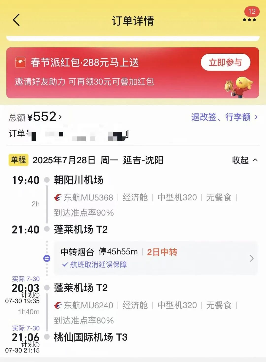 “我在在线旅游平台检索各个机场,找那些在烟台中转且中转时长在2天及以上的航班。这种机票并不好找,需要一个个搜索。”柳馨说,她最终找到了2025年7月28日从吉林延吉出发、在烟台中转、最终目的地是沈阳的航班。