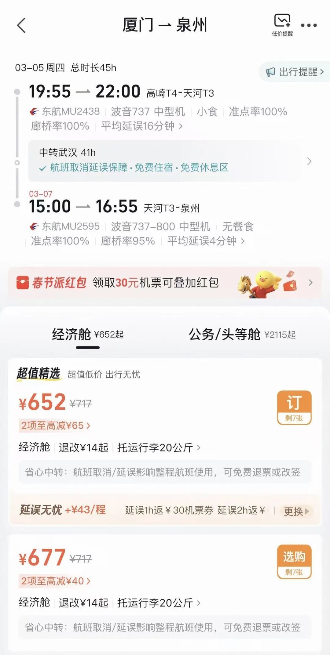 中新经纬查询发现,3月5日,广东揭阳飞深圳、中转湖北武汉的一趟航班,提供免费住宿、免费休息区、免费寄存等服务。免费住宿服务上,提供的是“一人一床位”的住宿条件。免费休息区上,提供的是免费使用武汉机场中转休息区。3月5日,福建厦门飞泉州、中转武汉的航班,也提供免费住宿、免费休息区、免费寄存等服务,形式上与前述航班类似。